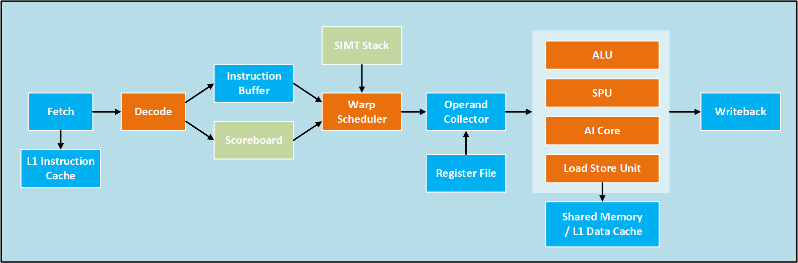 在Core中,Scheduler模块主要与Decode模块、Operand Collector模块以及Simt Stack模块相连。其主要功能是从Decode模块的Ibuffer中取出一条有效指令发射到Operand Collector模块, 以及处理控制流相关指令。